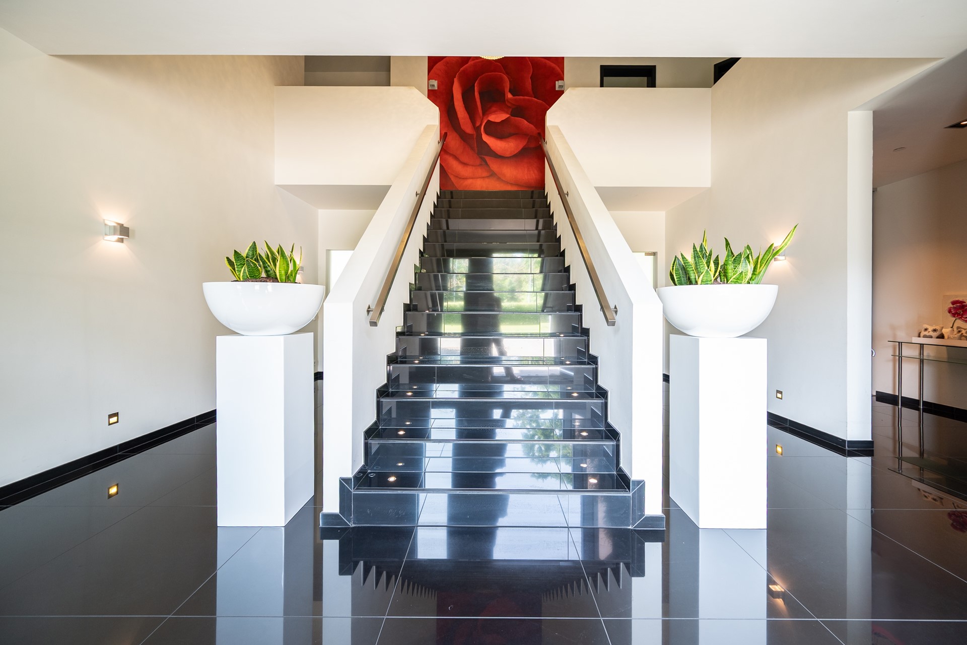 Bij binnenkomst in de woning komt u in een royale entreehal die direct indruk maakt met zijn openheid en lichtinval. Rechts van de hal leidt tot een tussen hal (garderobe) met stijlvol geïntegreerde inbouwkasten voor uw garderobe. Een ruim en luxe uitgevoerde gastentoilet. Aansluitend ligt hier ook de ruime kantoorruimte (mogelijk ook slaapkamer) die ideaal is om vanuit huis te werken. Aan weerszijden van de vrijstaande schitterende trap openen zich de doorgangen naar de lichte woonkamer en de aangrenzende luxe woonkeuken. De grote glazen puien overspoelen de woonkamer met daglicht en bieden uitzicht op grote terras en al het achter gelegen groen/bos.