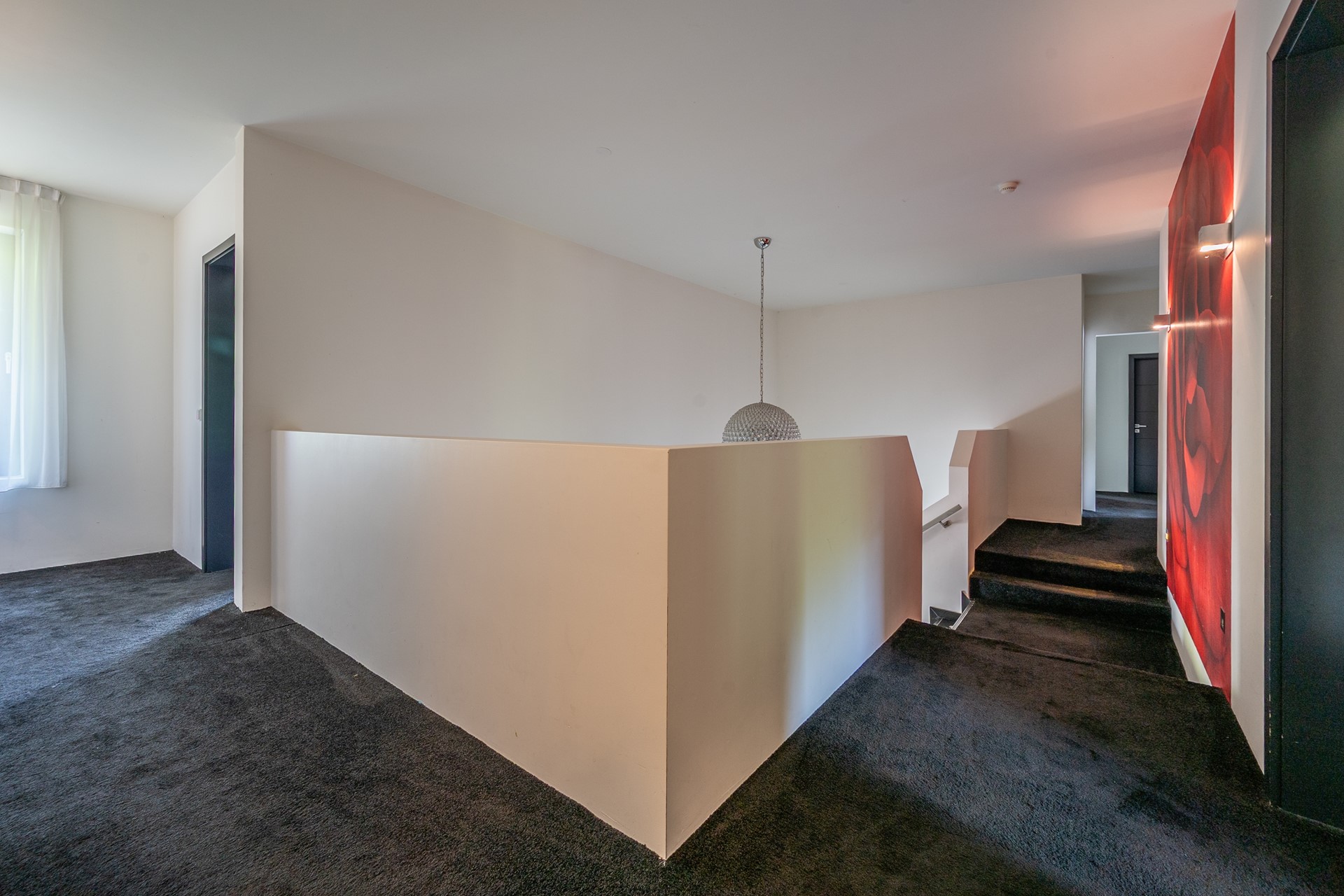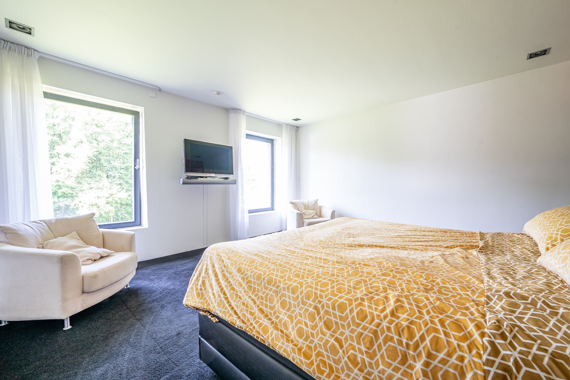 Via de prachtige vrijstaande trap bereikt men de bovenverdieping, die verrast met een indrukwekkende vide. Aan de achterzijde bevindt zich de master Bed-room met uitzicht over de tuin. Hier kan men wakker worden en de herten in de ochtend door je eigen tuin zien lopen. De master Bed-room is volledig en-suite uitgevoerd, eerste kom je in een tussenruimte die toegang biedt tot een aparte toiletruimte, badkamer, diversen inloopkasten en de slaapkamer zelf. De luxe badkamer is voorzien van een ruime inloopdouche en dubbele wastafel. De gastenslaapkamer beschikt eveneens over een eigen badkamer met inloopdouche, toilet en wastafel. Het ruimteaanbod wordt verder aangevuld met drie extra slaapkamers, die flexibel inzetbaar zijn als kinderkamer, logeerkamer of hobbyruimte. Een praktische wasruimte met aansluiting voor wasmachine en droger maakt de bovenverdieping functioneel compleet. De zolder welke met een vaste trap bereikbaar is, is zeer ruim van opzet, ideaal om als studio of hobbyruimte in te vullen. Bergkasten zijn er ook voldoende om veel spulletjes op te bergen.