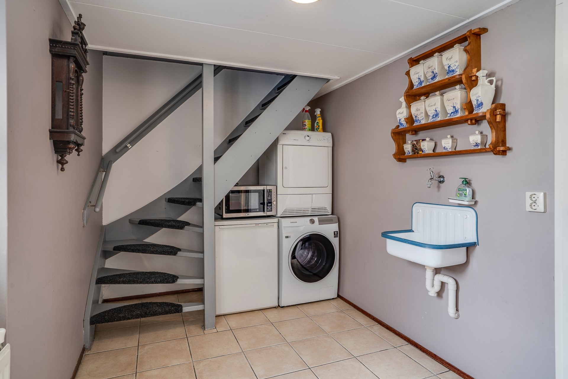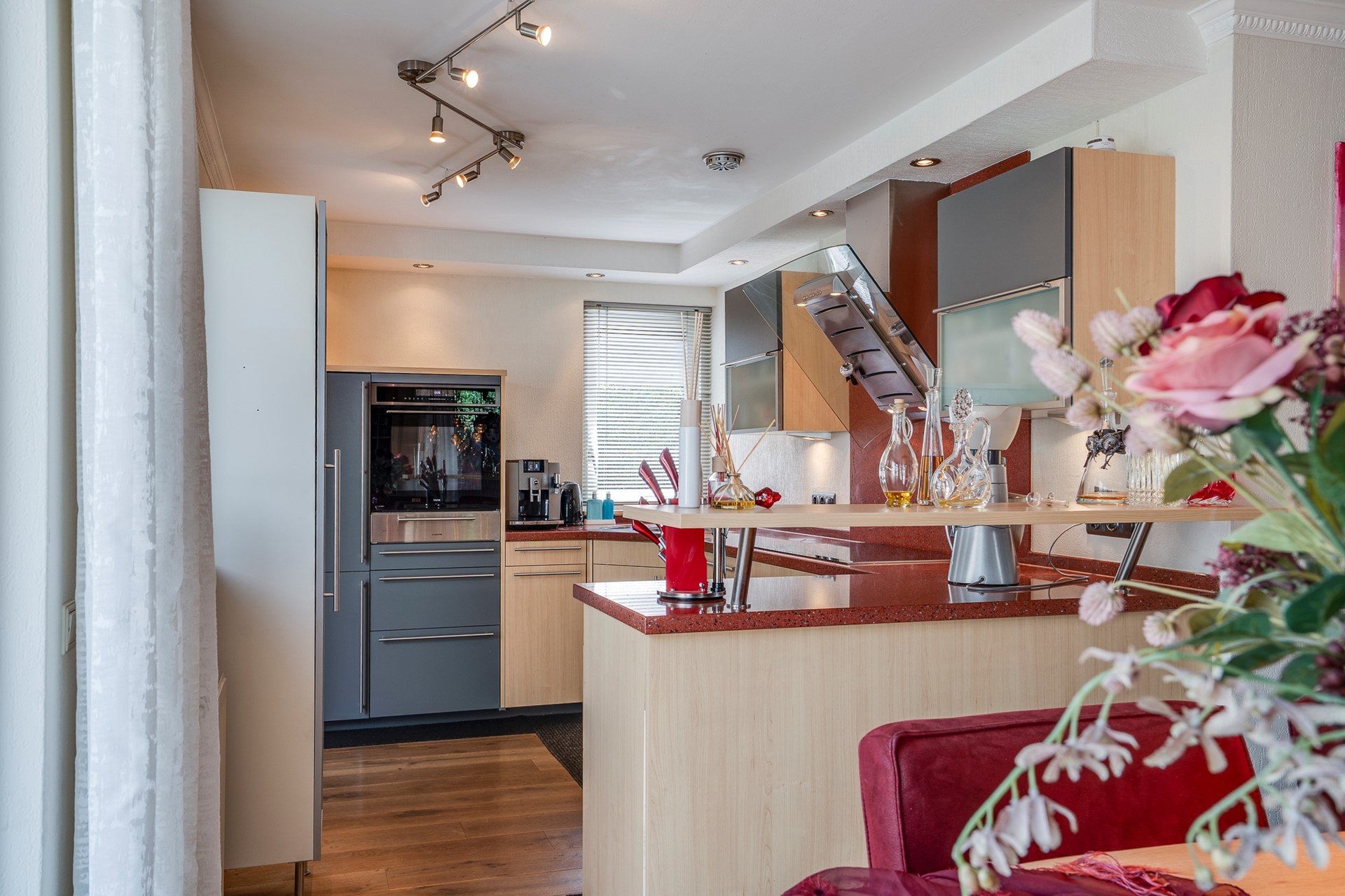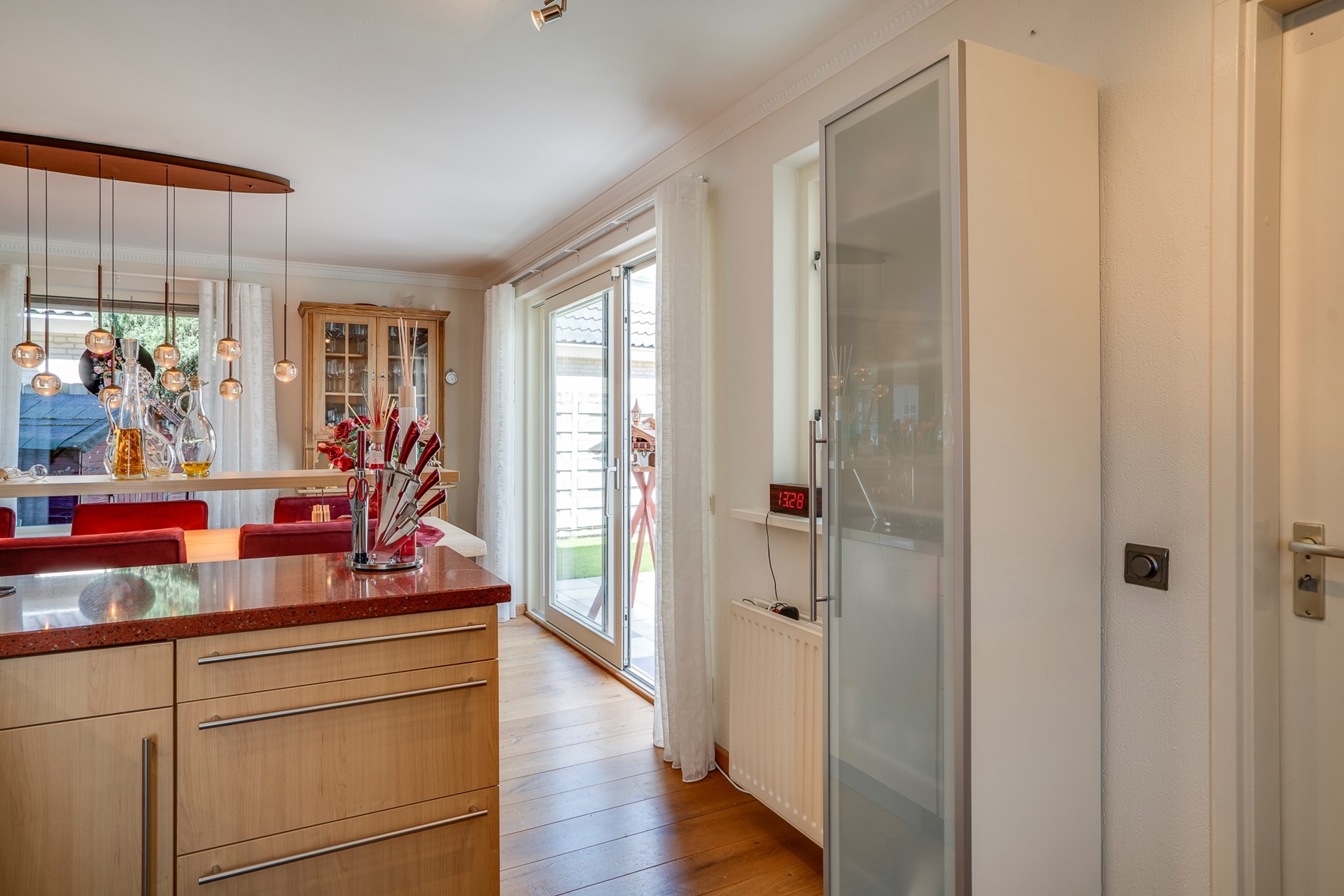 De halfopen keuken is praktisch ingedeeld in een L-opstelling met de gewenste inbouwapparatuur waarvan recent deels vernieuwd de inductiekookplaat en combi-oven. Aansluitend bevindt zich de wasruimte met plavuizenvloer en witgoedaansluiting.