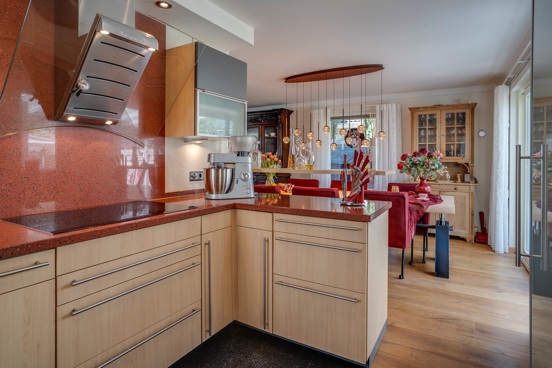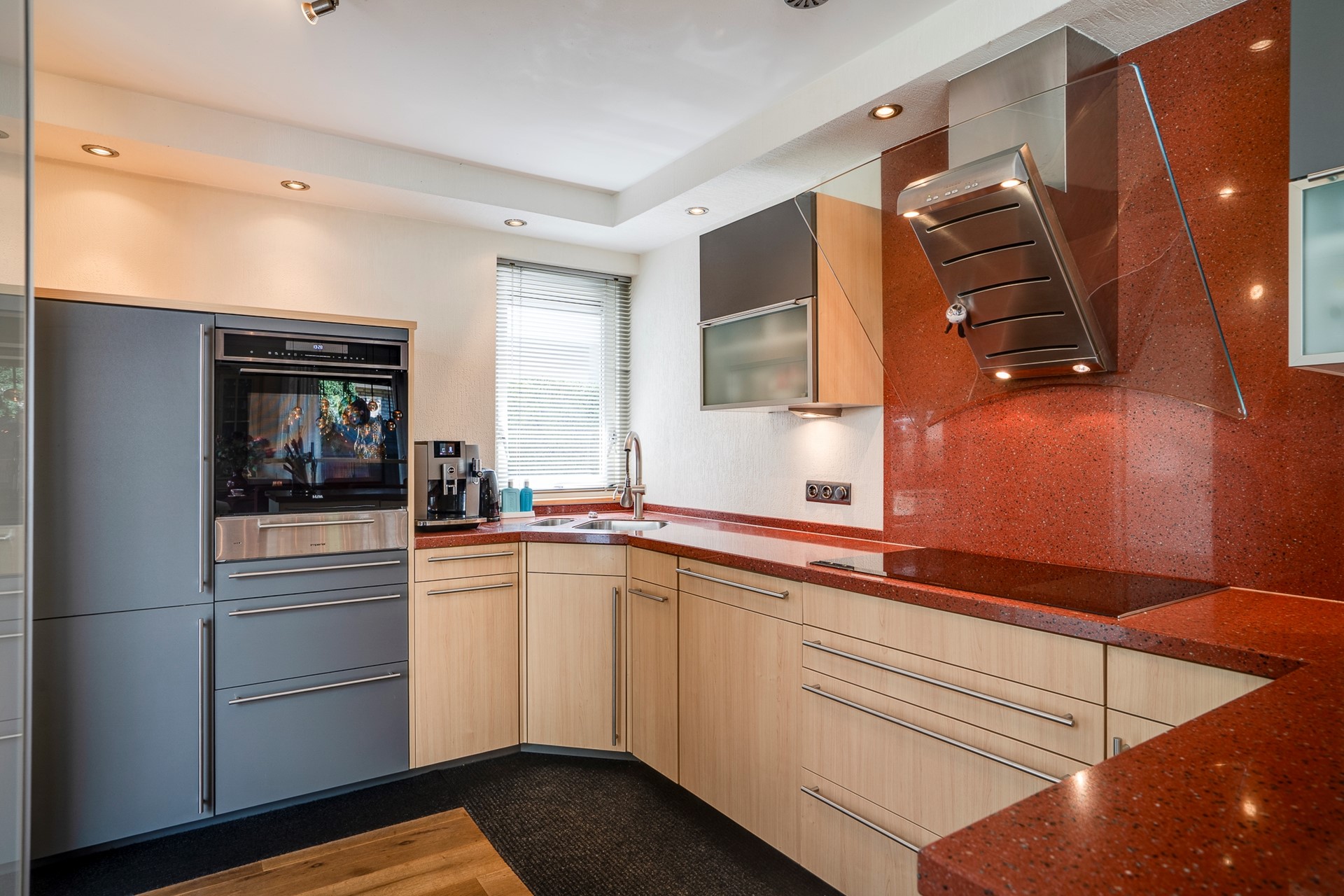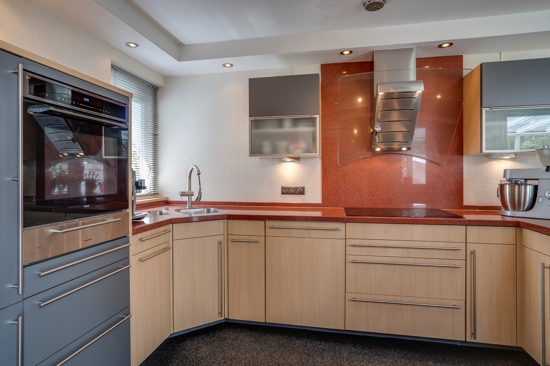 De halfopen keuken is praktisch ingedeeld in een L-opstelling met de gewenste inbouwapparatuur waarvan recent deels vernieuwd de inductiekookplaat en combi-oven. Aansluitend bevindt zich de wasruimte met plavuizenvloer en witgoedaansluiting.