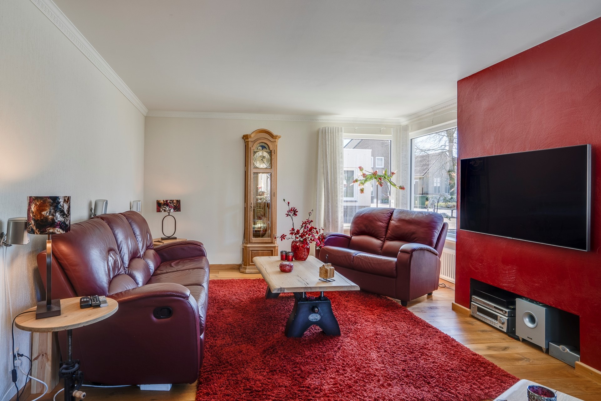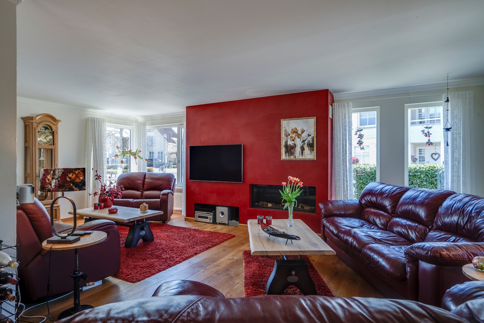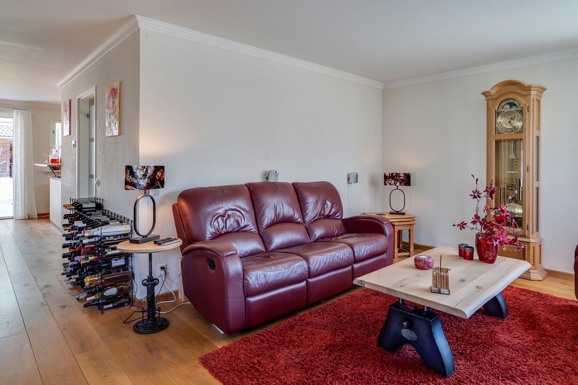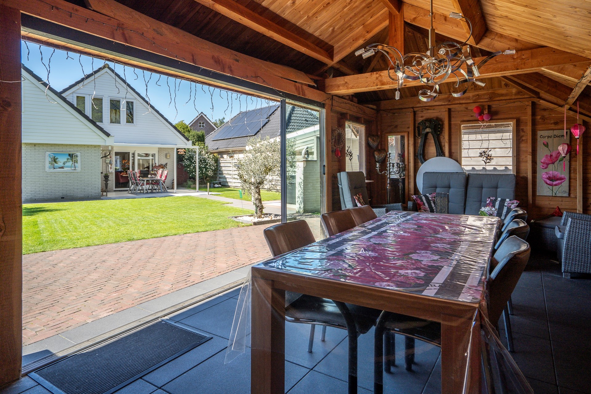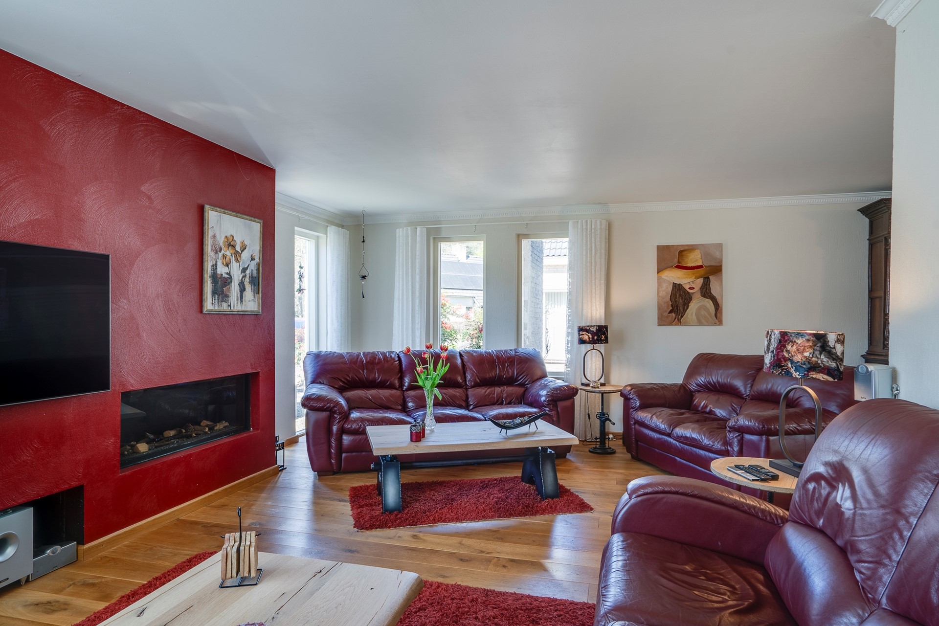 Je betreedt de woning via een nette hal met hardhouten vloer, toiletruimte en meterkast (voorzien van krachtstroom). De ruime L-vormige woonkamer met hard houten vloer is een fijne leefruimte met veel lichtinval, een sfeervolle ingebouwde gashaard en een schuifpui naar het overdekte terras — perfect voor binnen-buiten leven.