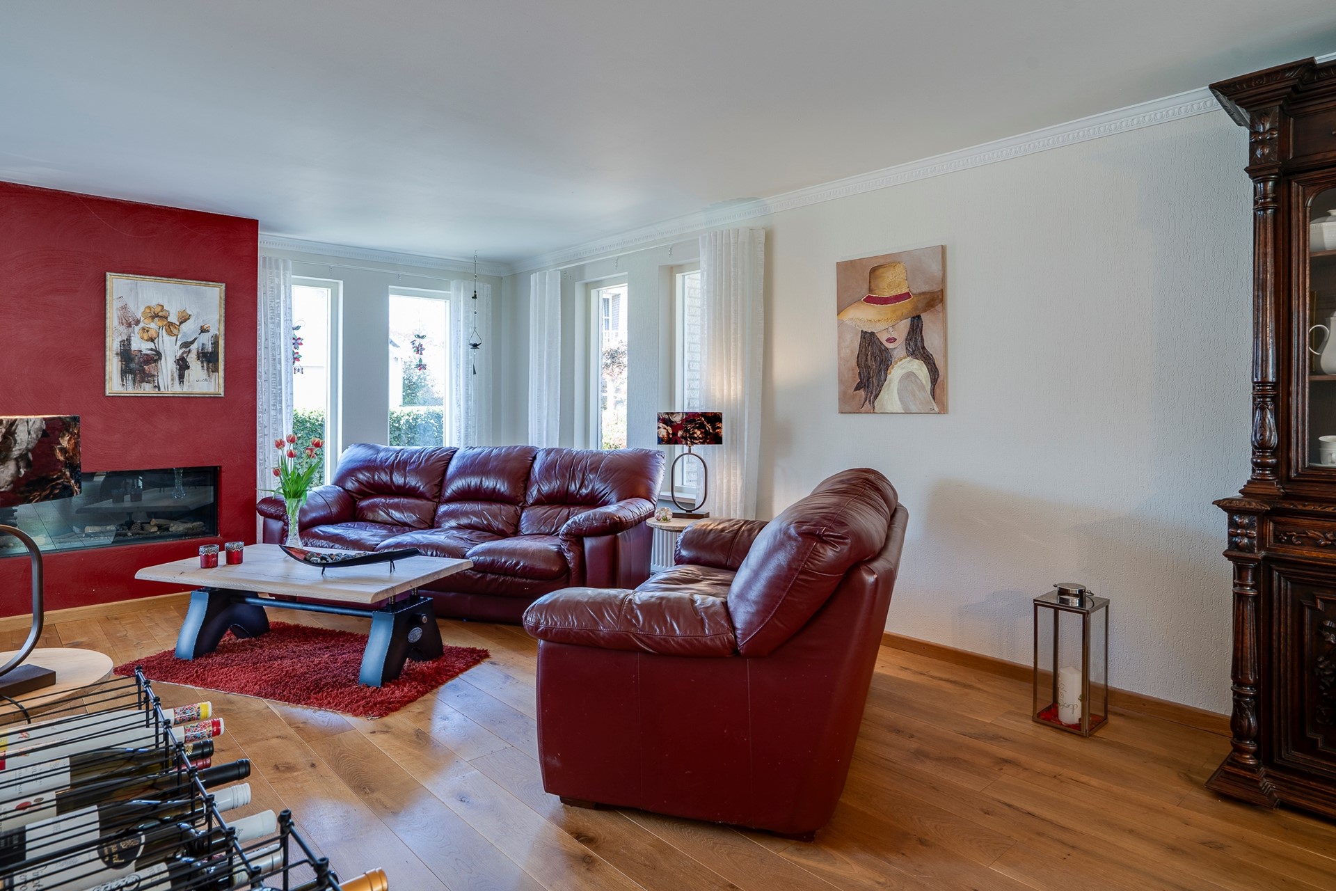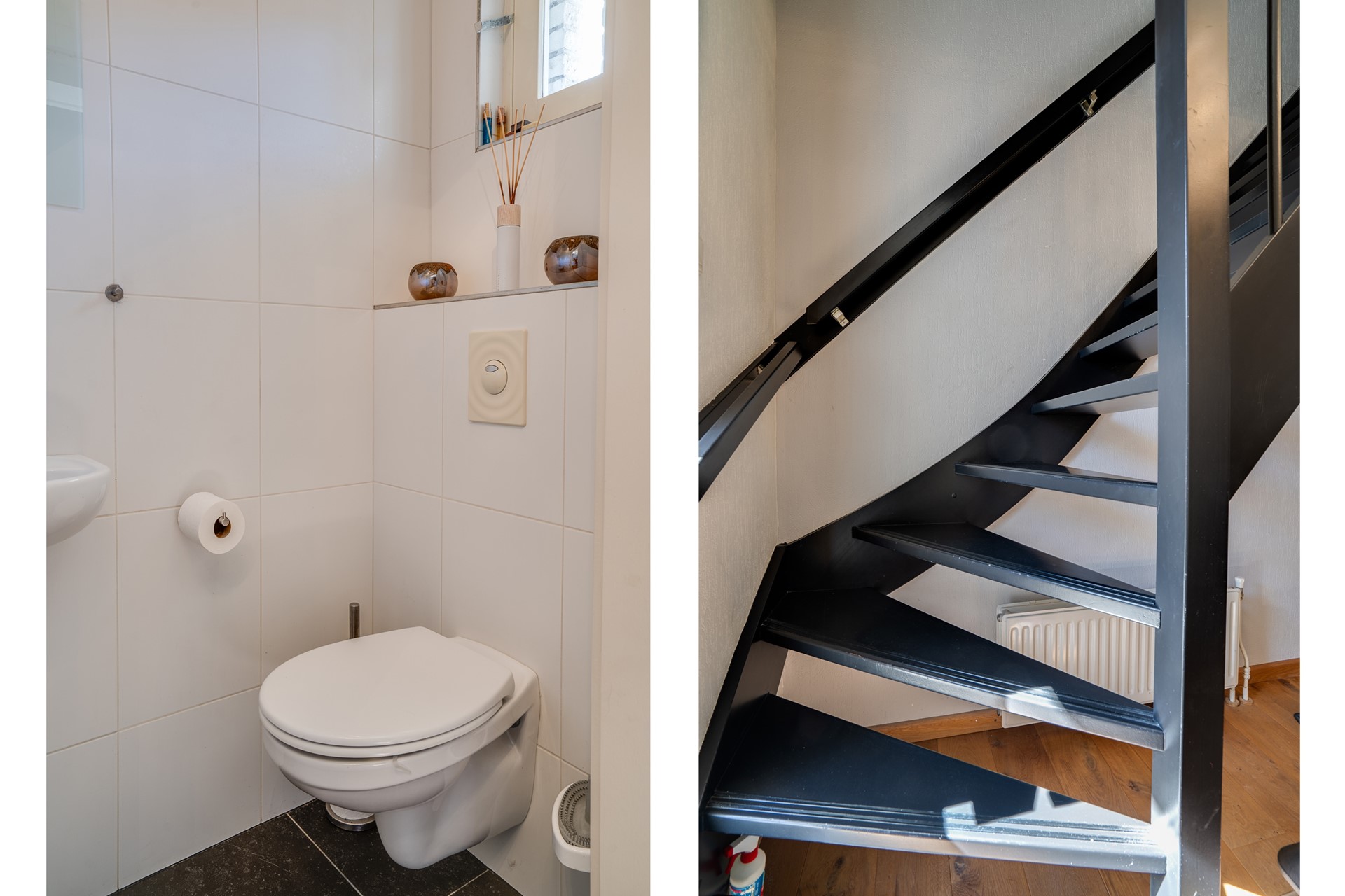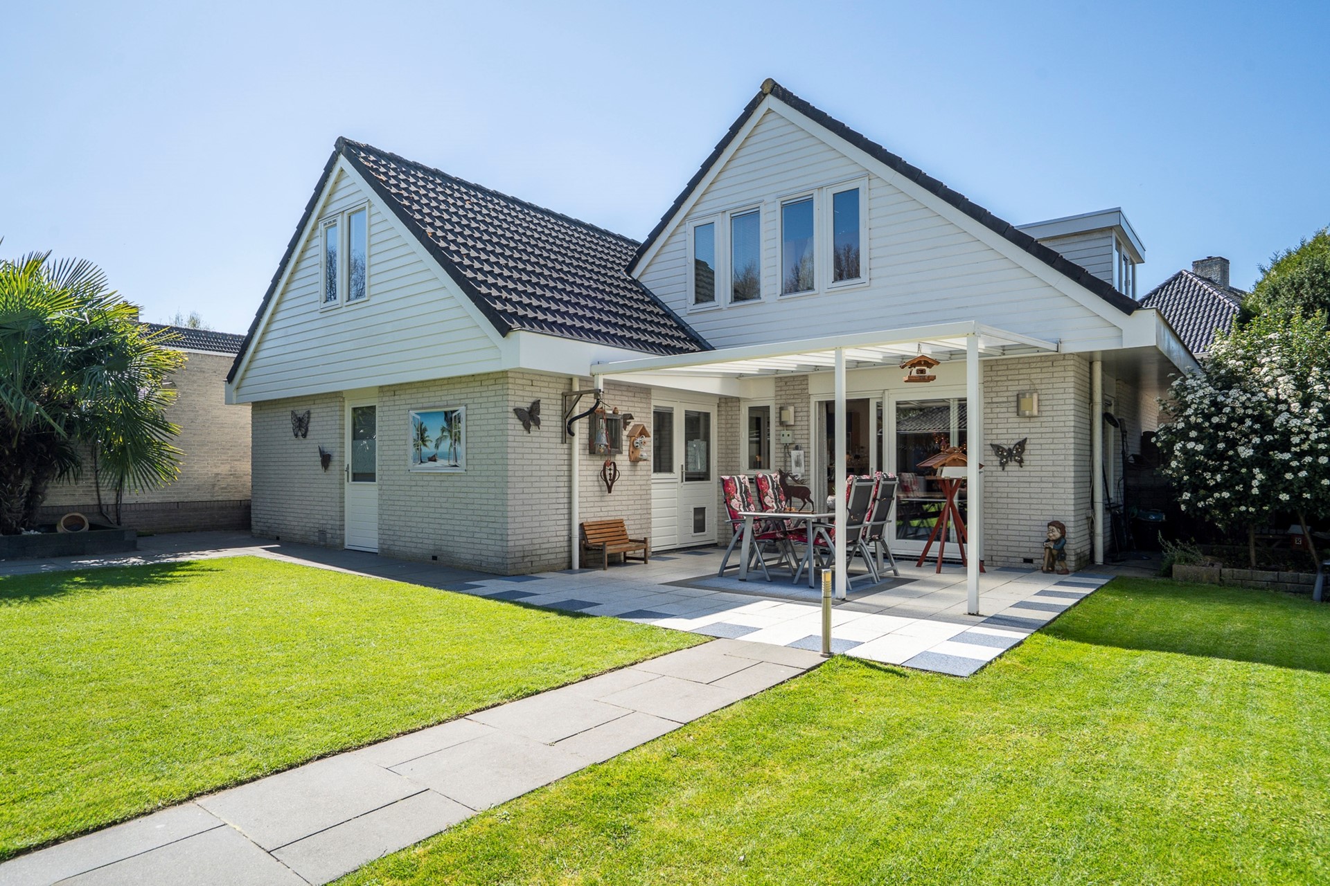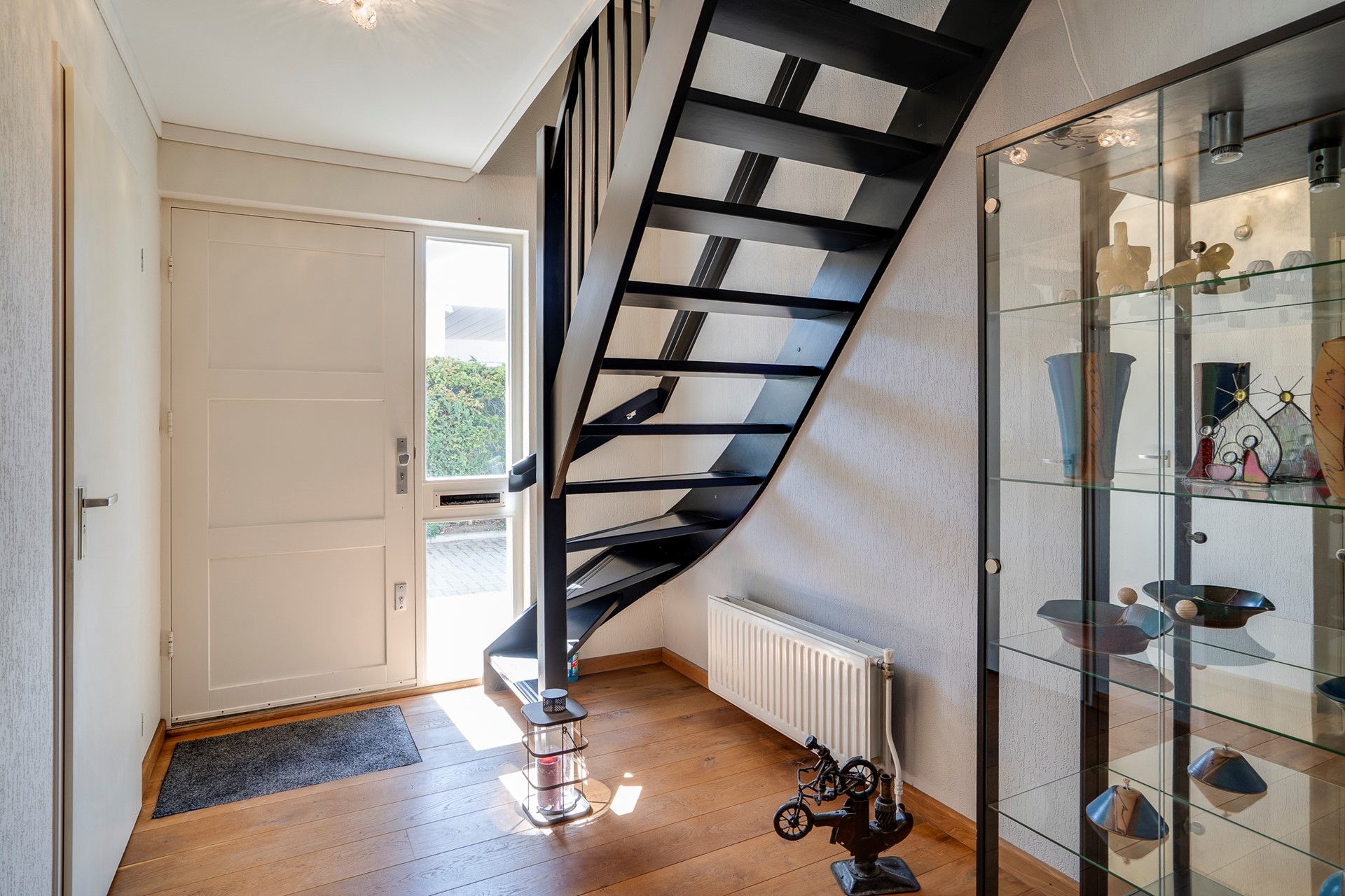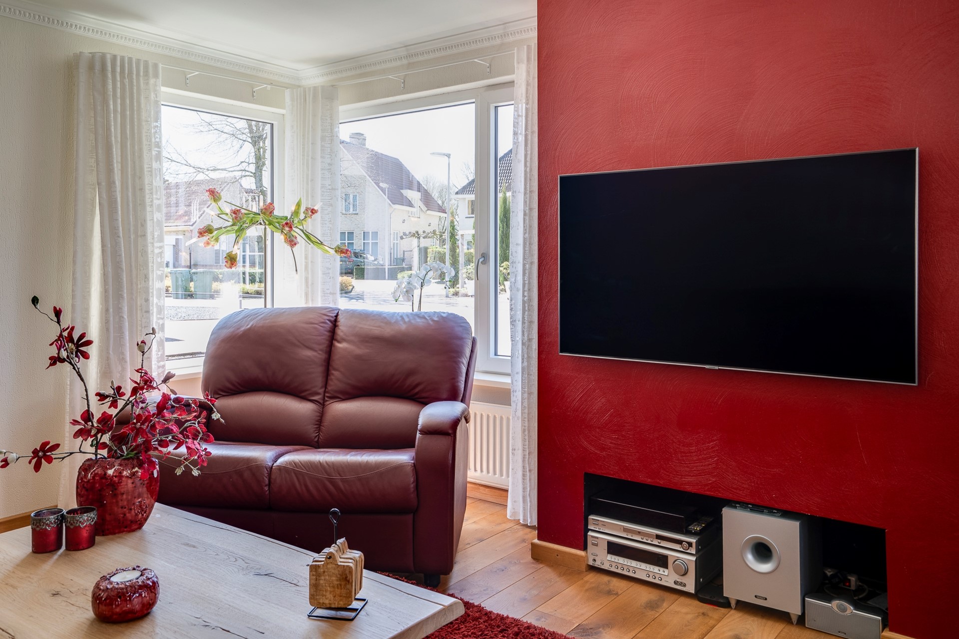 Je betreedt de woning via een nette hal met hardhouten vloer, toiletruimte en meterkast (voorzien van krachtstroom). De ruime L-vormige woonkamer met hard houten vloer is een fijne leefruimte met veel lichtinval, een sfeervolle ingebouwde gashaard en een schuifpui naar het overdekte terras — perfect voor binnen-buiten leven.
