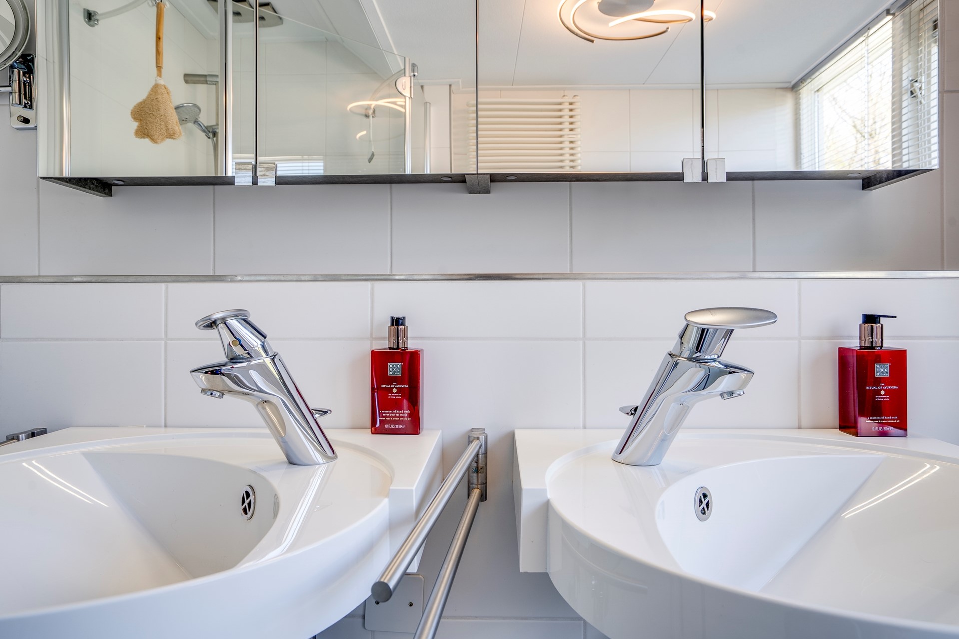 Een moderne badkamer met dubbele wastafel, ligbad en douche