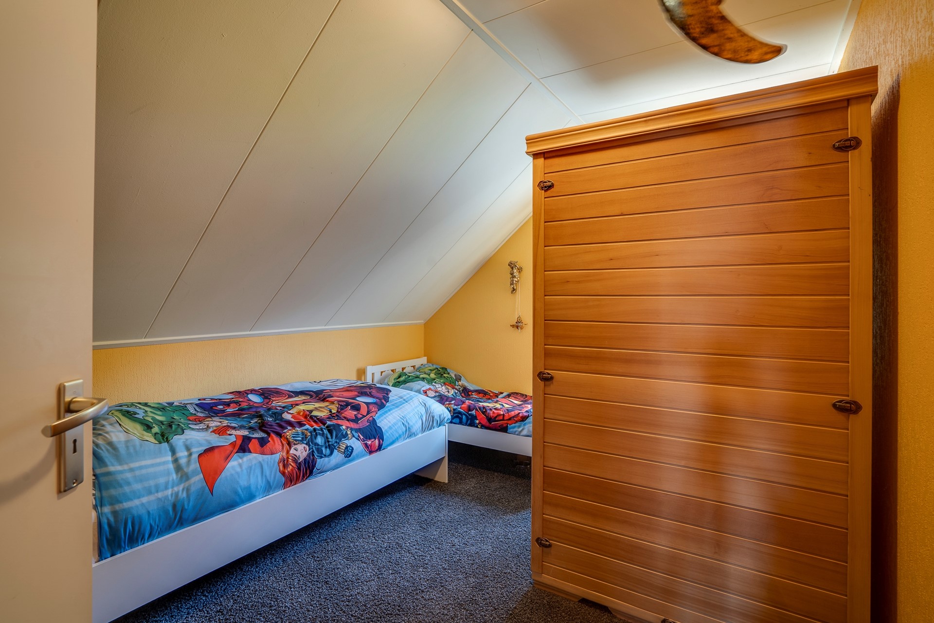 Vanuit hier is de inpandige garage bereikbaar, voorzien van een elektrische poort, loopdeur en directe toegang tot de tuin. Boven de garage is een extra gastenkamer gerealiseerd — ideaal voor logés of een werkruimte.