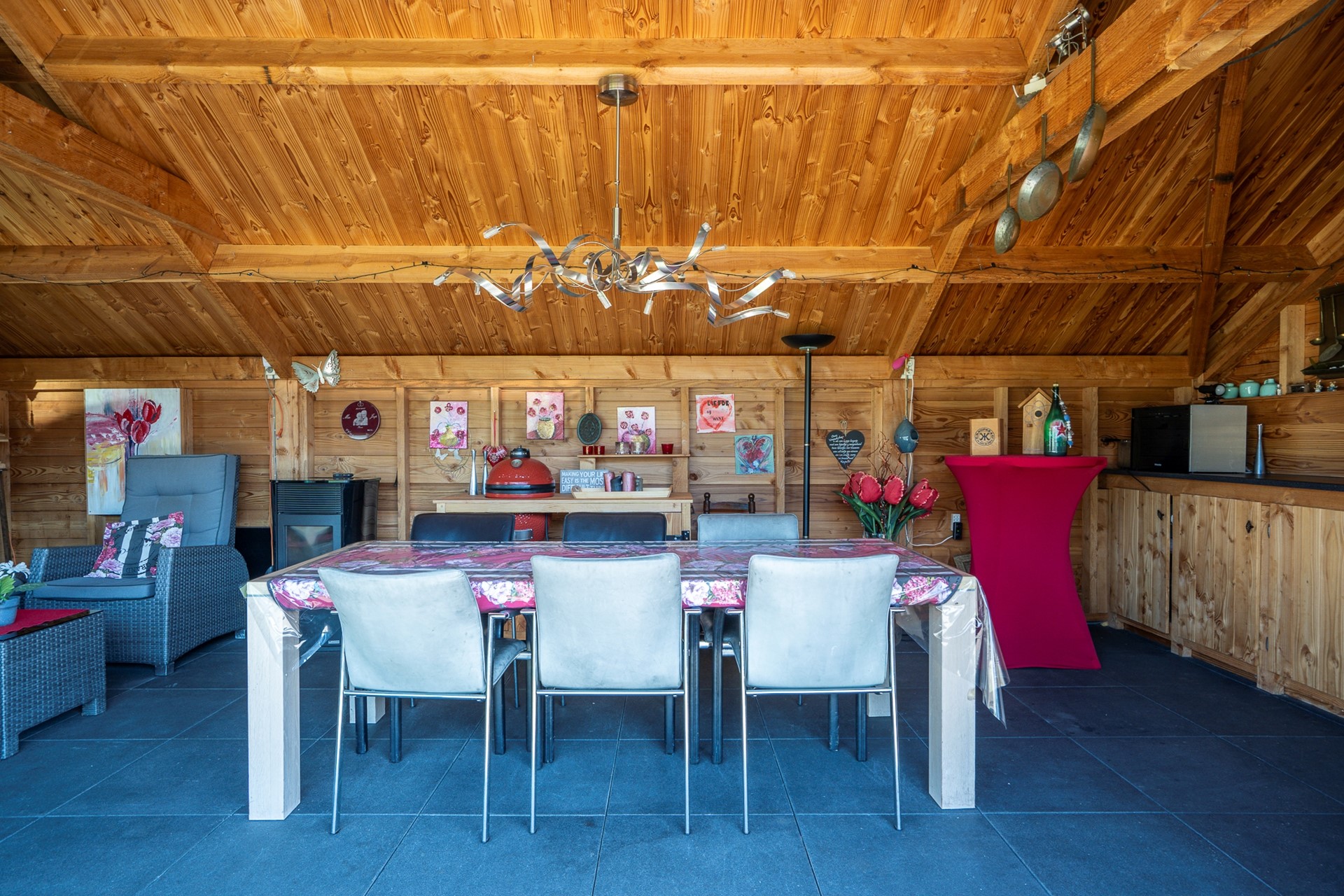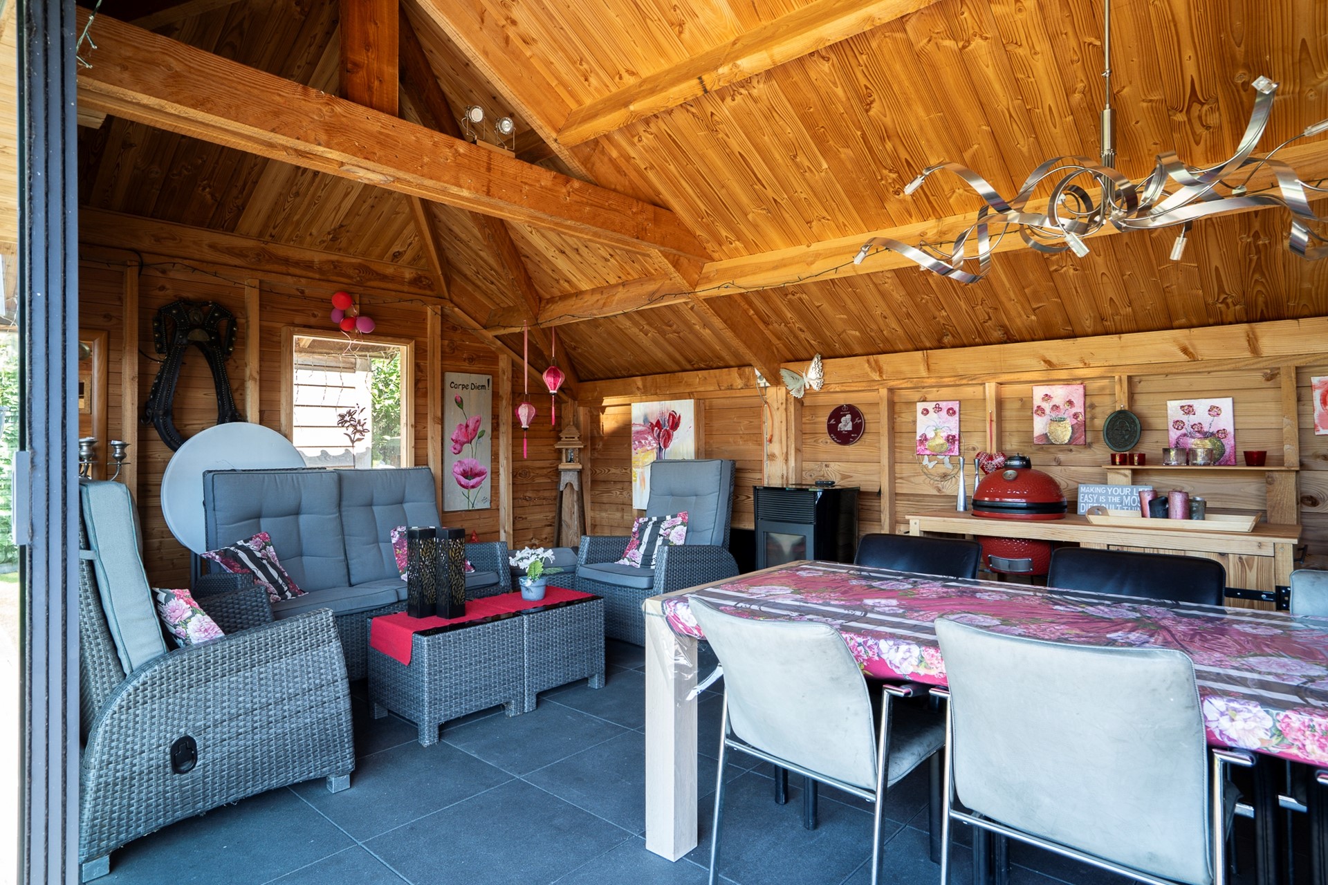 De luxe Franse kapschuur is een absolute blikvanger: afsluitbaar met glazen schuifdeuren en voorzien van een moderne pelletkachel, waardoor je hier het hele jaar door comfortabel kunt genieten. Daarnaast beschikt de kapschuur over een keukenblok met bergruimte.