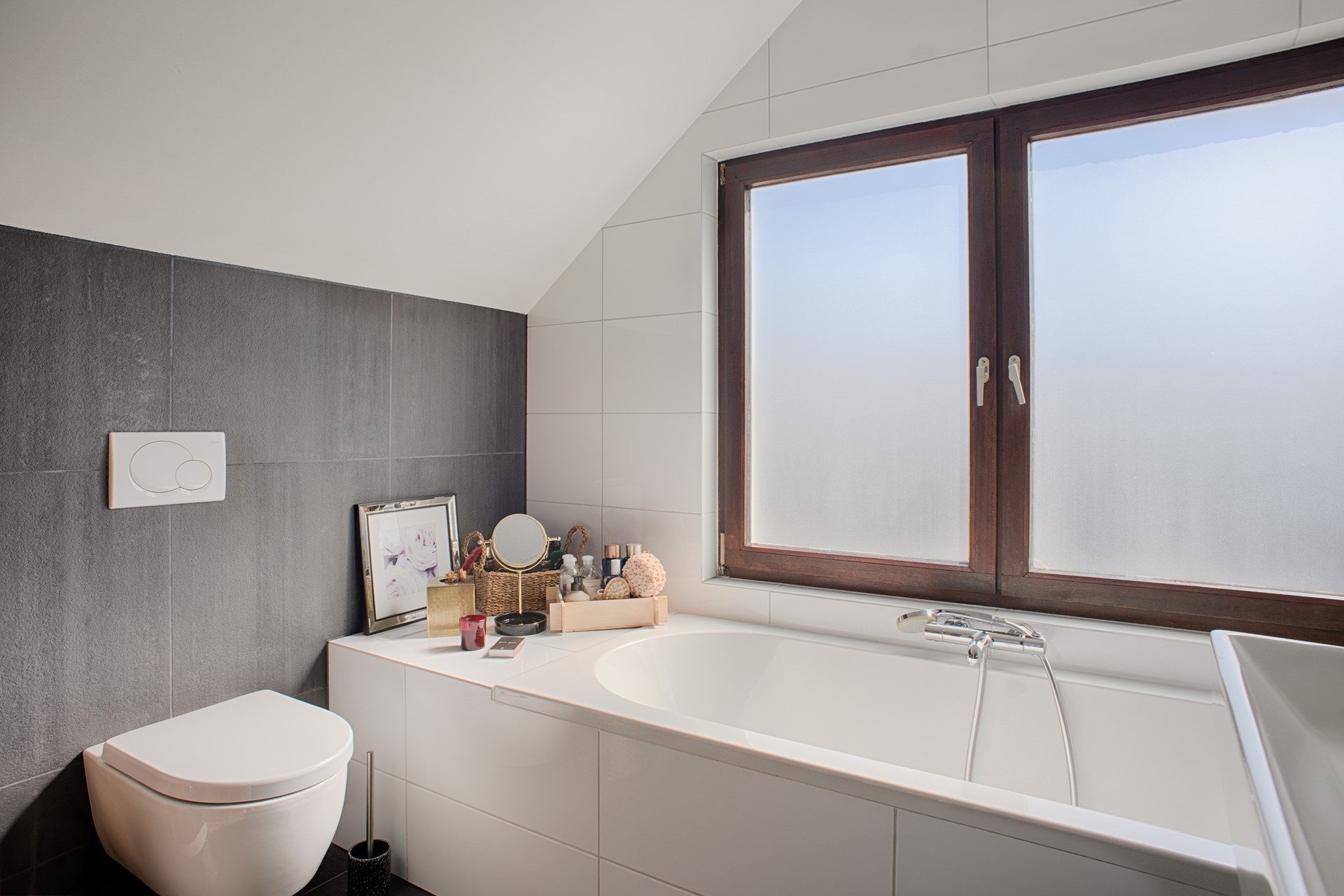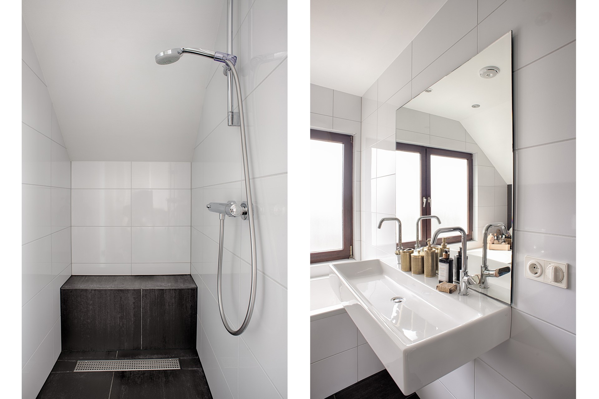 Overloop, drie slaapkamers en een moderne badkamer met inloopdouche, ligbad, tweede toilet en dubbele wastafel.