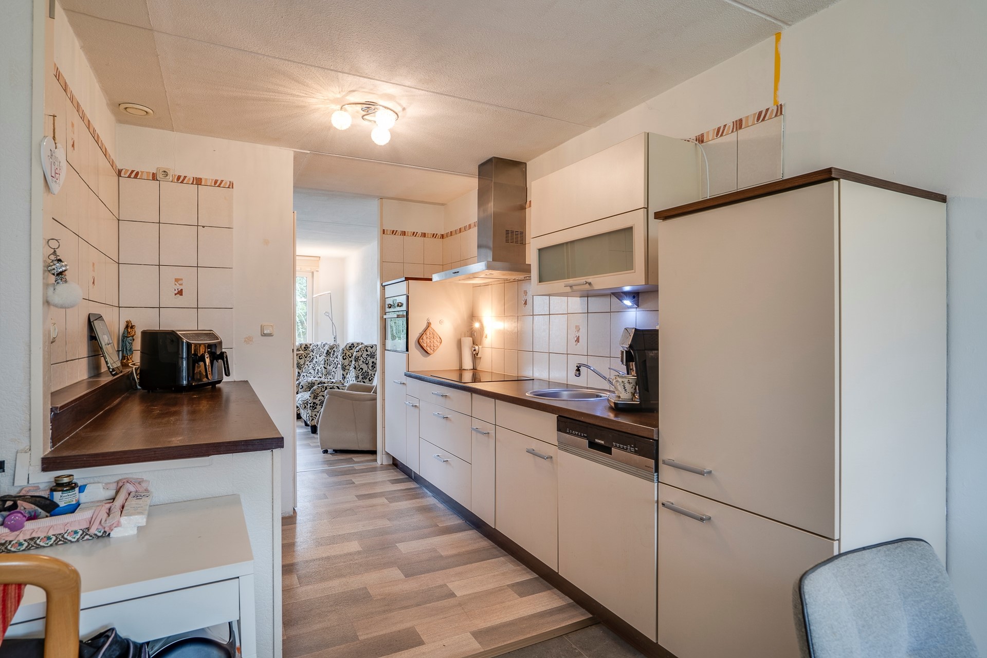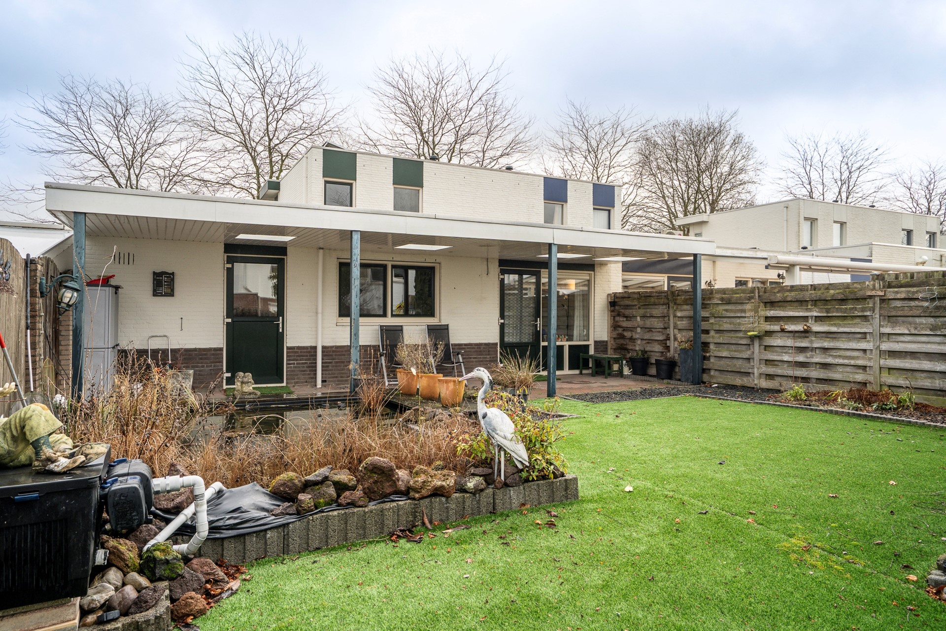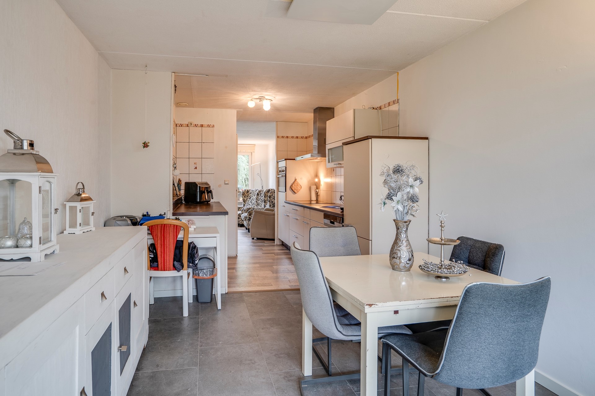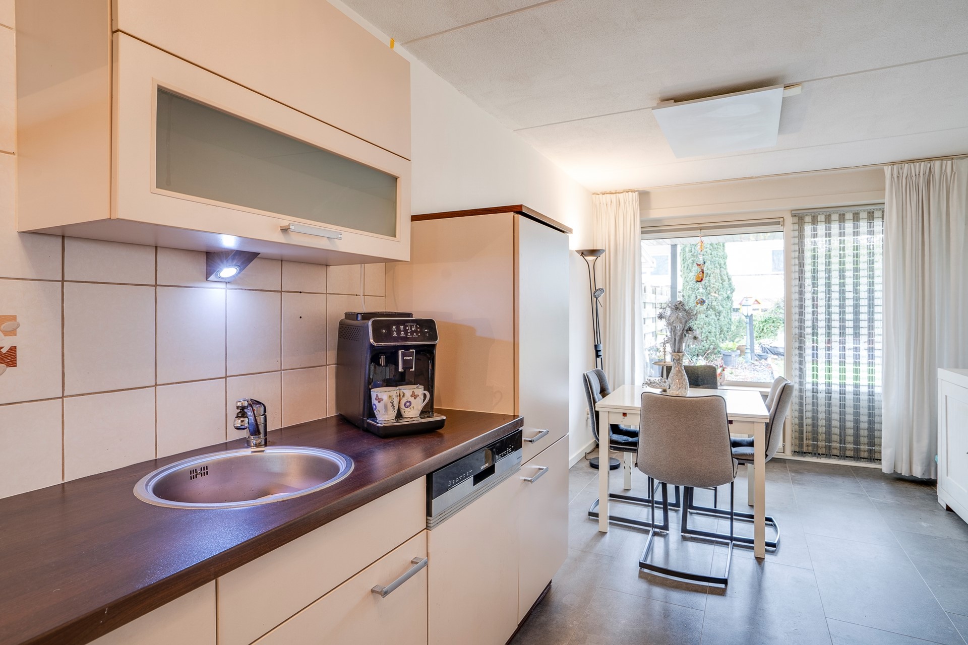 Aansluitend bevindt zich de keuken met inbouwapparatuur en een separaat werkblok met extra kastruimte. De aansluitende eetkamer biedt een mooi zicht op de verzorgde achtertuin. Over de volledige breedte van de woning is een ruim terras met overkapping gerealiseerd, voorzien van lichtkoepels — een heerlijke plek om vrijwel het hele jaar door buiten te genieten.