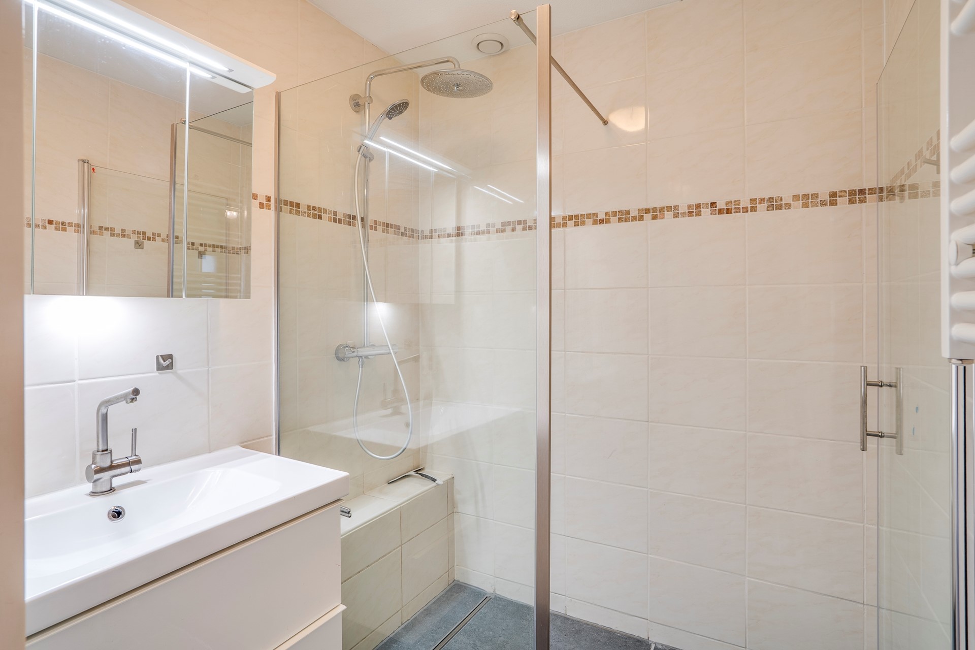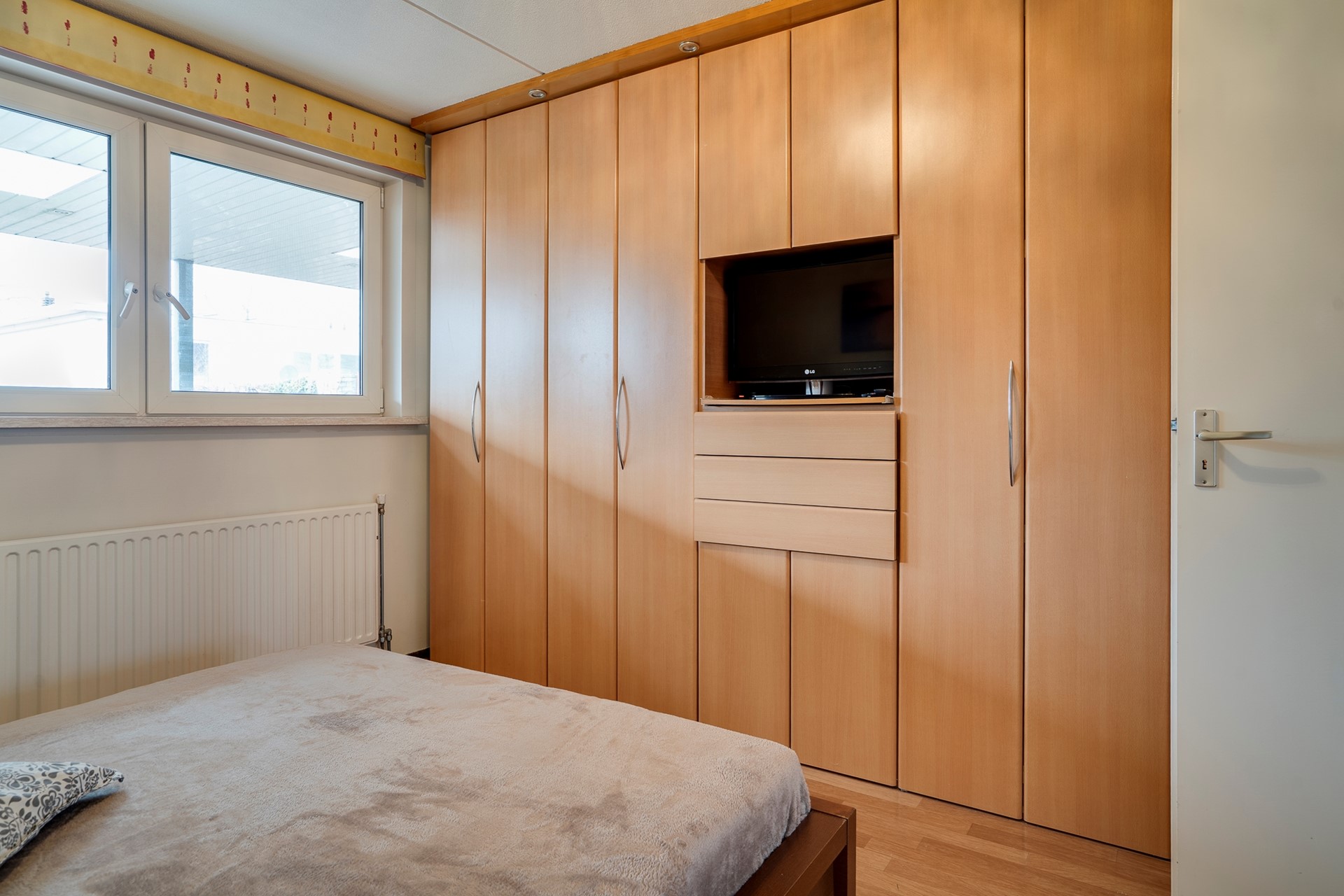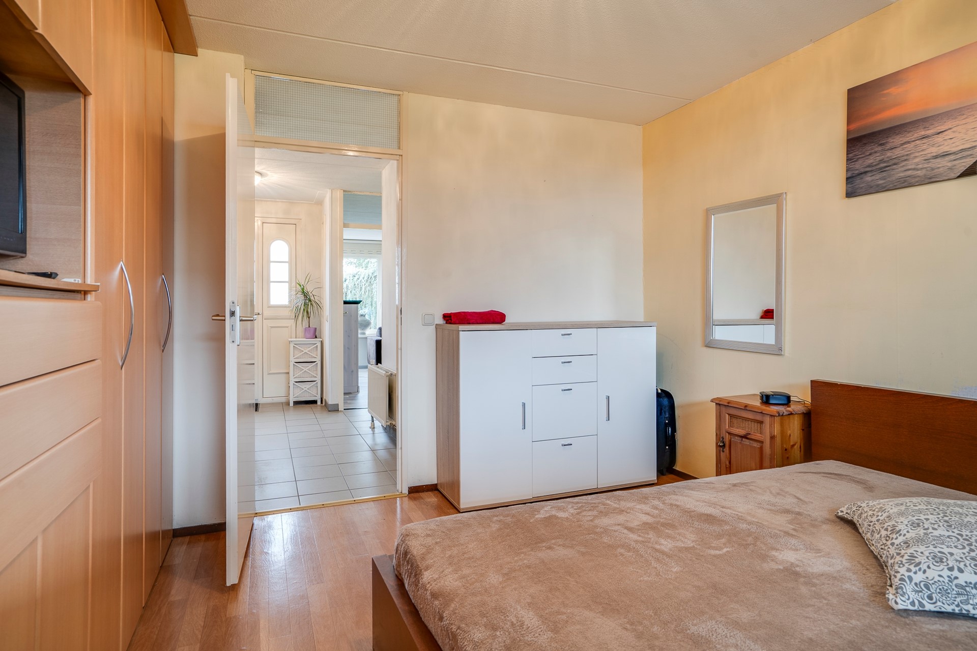 De ouderslaapkamer bevindt zich op de begane grond en beschikt over een vaste garderobekast. Aansluitend treft u de recent gemoderniseerde badkamer met inloopdouche, vaste wastafel met badmeubel, designradiator en spiegel.
